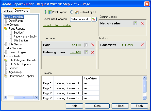 Step 2 to define the analytics layout of the data in your request. The list of metrics and dimensions in report builder follow the menu layout displayed in reports and analytics. You can add metrics and dimensions to the request wizard: Dimensions are variables in adobe analytics that typically contain string values. They can be added to any calculated metric formula to create an internal segment on the fly. Common dimensions include page, referring domain, or an evar.in contrast, metrics contain numeric values that tie to a dimension. Dimensions are now available in the calculated metric builder. A collection of videos and tutorials for adobe analytics... Step 2 to define the analytics layout of the data in your request.